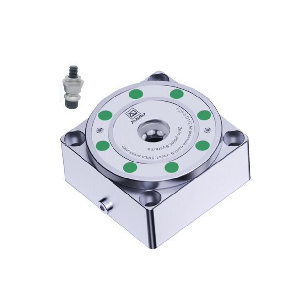 The K20.3 zero-point pneumatic chuck is a fast positioning fixture designed to be used in conjunction with the chuck and pull studs.The compressed air machine and the chuck are connected to the pneumatic switch via air hoses. This enables the chuck to control the air flow, allowing the spherical balls inside the chuck to either lock or release the pull studs, Thus facilitate the interchange of tooling plates.The positioning holes of the chuck undergo coordinate grinding, ensuring a precise fit with the pull studs. Its repeat positioning accuracy can reach 0.005, providing a reliable guarantee for machining, ensuring the accuracy and consistency of each positioning operation.