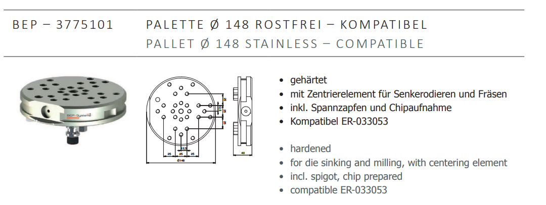 BEP-SYSTEME BEP-3775101 Pallet Diameter 148 Stainless-Compatible,EROWA EDM tooling China manufacturer