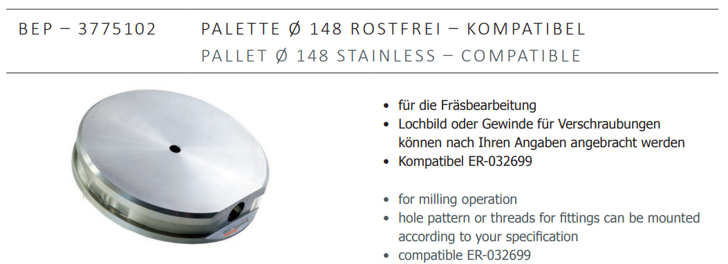 BEP-SYSTEME BEP-3775102 Pallet Diameter 148 Stainless-Compatible,EROWA EDM tooling China manufacturer