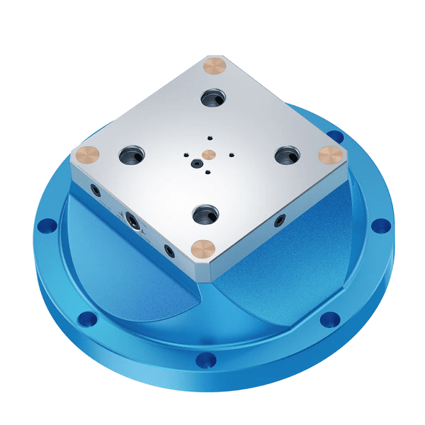 The D325-L100 heightening block raises the vise 100mm from the turntable surface for better access to all five sides of the workpiece in 5-axis applications, reducing tool holder and tool interference issues during 5-axis machining.The D96-D zero-point positioning chuck and H125 self-centering vise allow us to quickly position and clamp workpieces during machine processing. Its repeatable positioning accuracy is usually at the micron level, which can maintain the highly consistent workpiece during multiple positioning processes. This is important for high-precision part machining and processes that require dimensional consistency.
