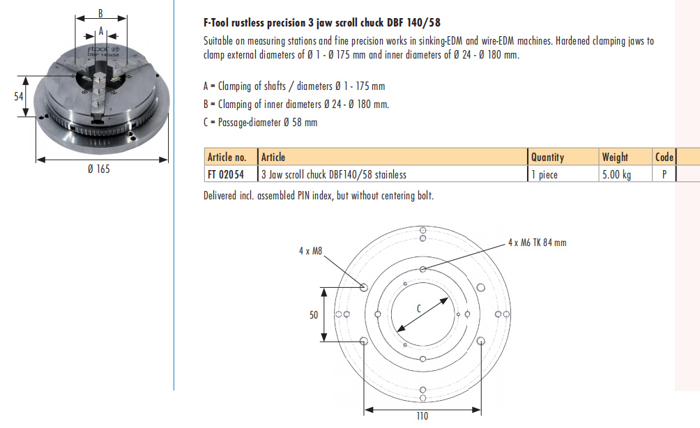 FT 02054 F-Tool rustless precision 3 jaw scroll chuck DBF 140/58 FTOOL WEDM,tooling holder chuck China manufacturer