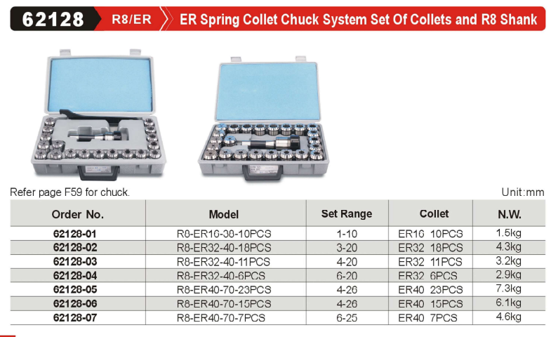 GinChan-62128 R8/ER ER Spring Collet Chuck System Set Of collets and R8 Shank,China manufacturer