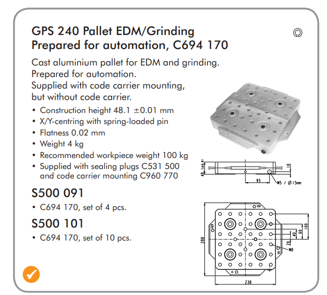 GPS 240 Pallet EDM/Grinding Prepared for automation S500 091,China manufacturer 3R EDM tooling system