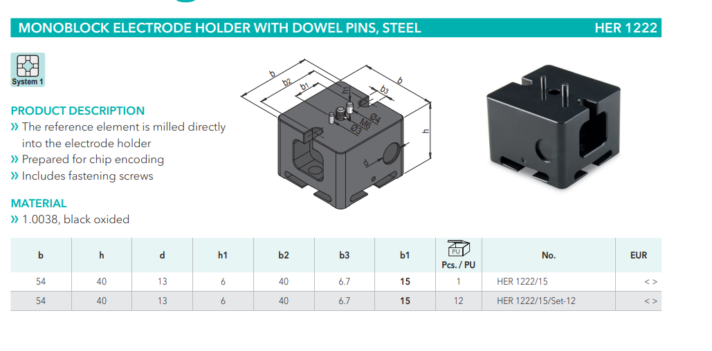 Meusburger HER1222 Monoblock electrode holder with dowel pins, steel, mold tools China Manufacturer alternative