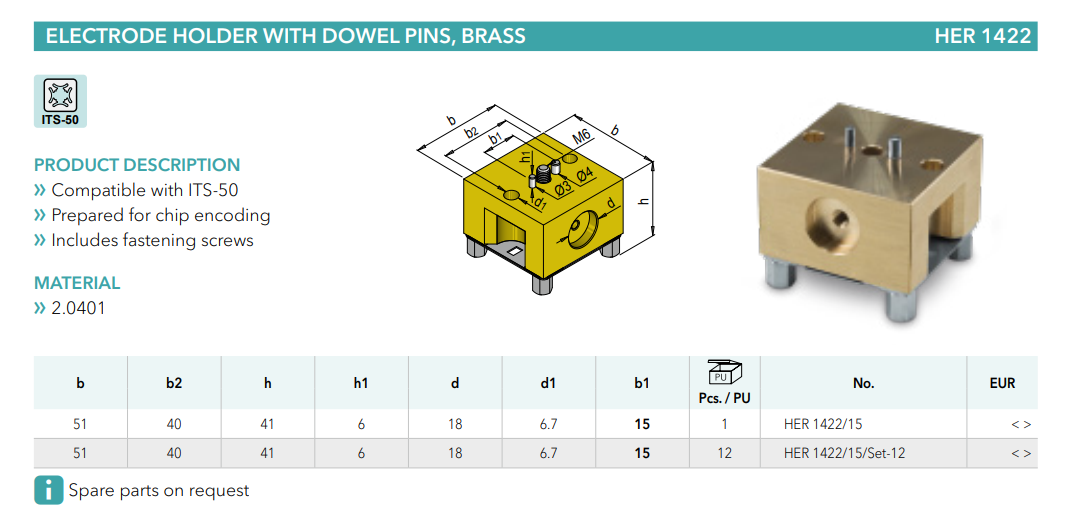 Meusburger HER1422 Electrode holder with dowel pins, brass, mold tools China Manufacturer alternative