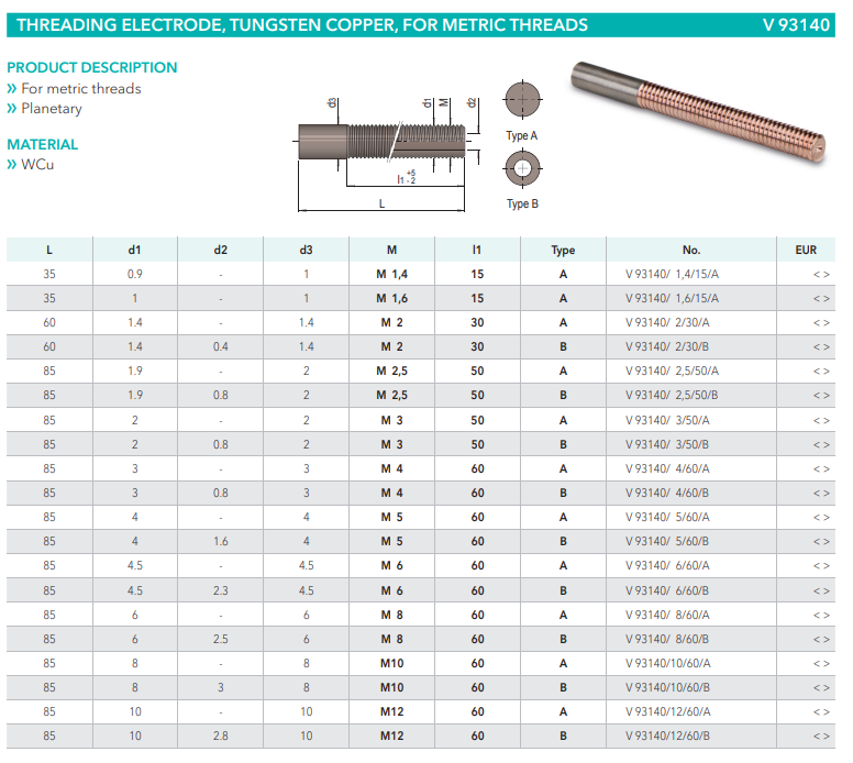 Meusburger V93140 Threading electrode, tungsten copper, for metric threads, mold tools China Manufacturer alternative