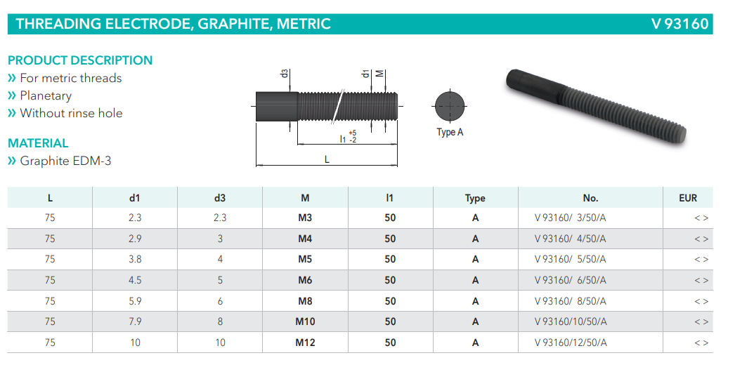 Meusburger V93160 Threading electrode, graphite, metric, mold tools China Manufacturer alternative