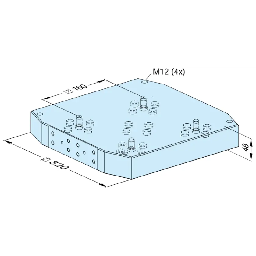 Aluminum pallet, 4-fold, pitch 160 mm. With hard Z support bolt. Excluding chucking spigots.