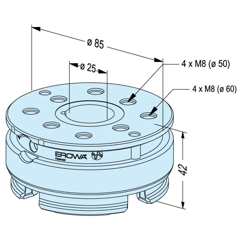 For use of PM85 II Precise chucks. With chucking spigot ER-039839 on: ProductionChuck 210 Combi, PowerChuck P, ITS Chuck 100 P and QuickChuck 100 P. To accommodate workpieces and fixtures in chip-cutting machining, EDM and WEDM, and powder presses.